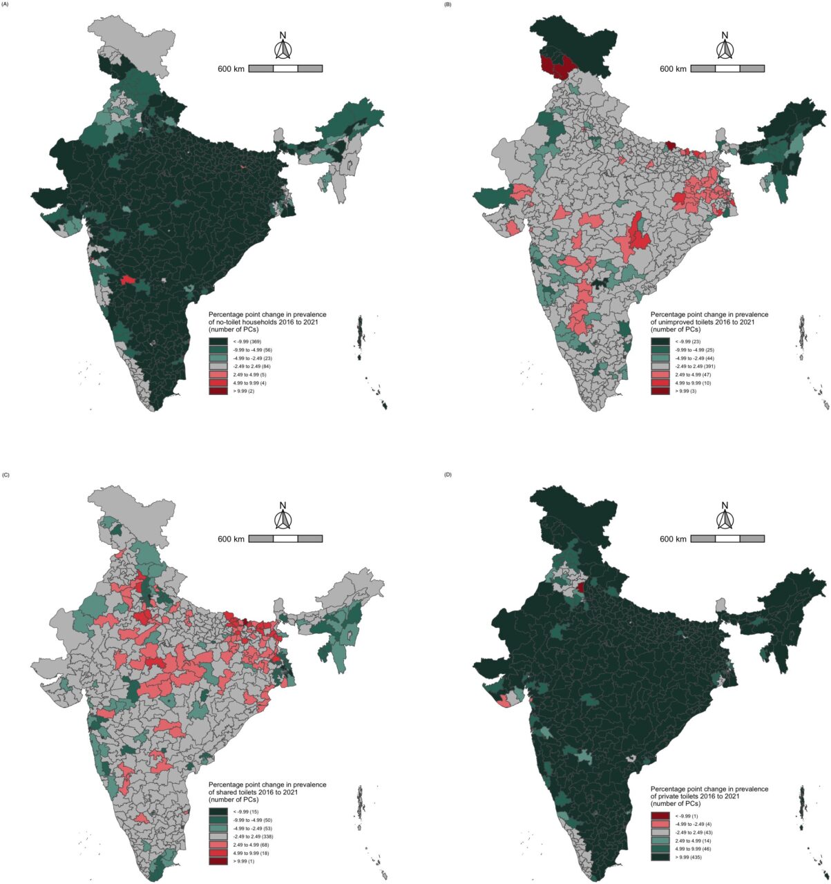 Analyzing changes in types of household sanitation among 543 Parliamentary Constituencies between 2016 and 2021 in India